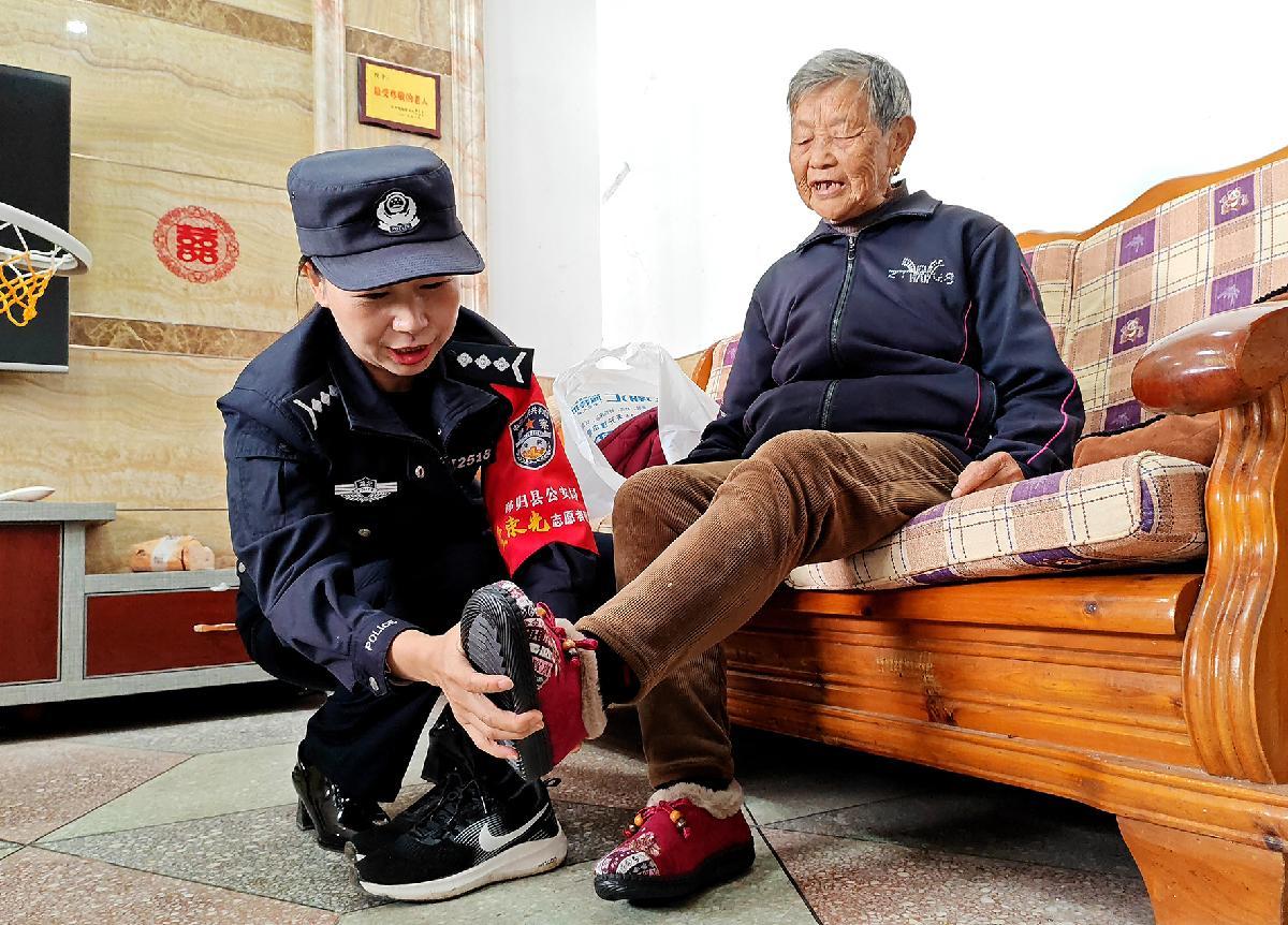 10月28日,在湖北省宜昌市秭归县茅坪镇陈家冲村四组,秭归县公安局一束光志愿服务队上门慰问现年82岁、照护残障儿子58年的母亲望开琼。