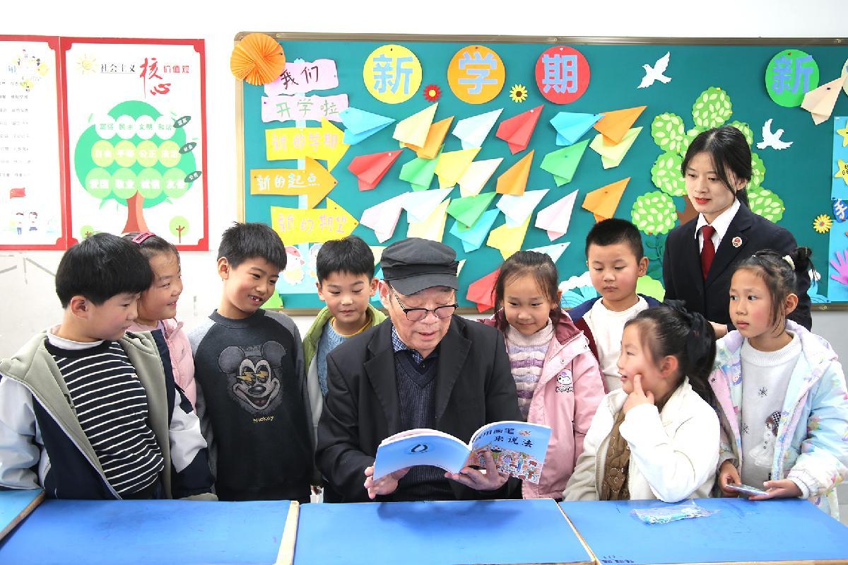 10月28日,江苏省睢宁县检察院72岁退休老党员郭克强和未检干警一起来到新城区第二小学,开展“‘银发力量’ 护‘未’成长”普法宣传。