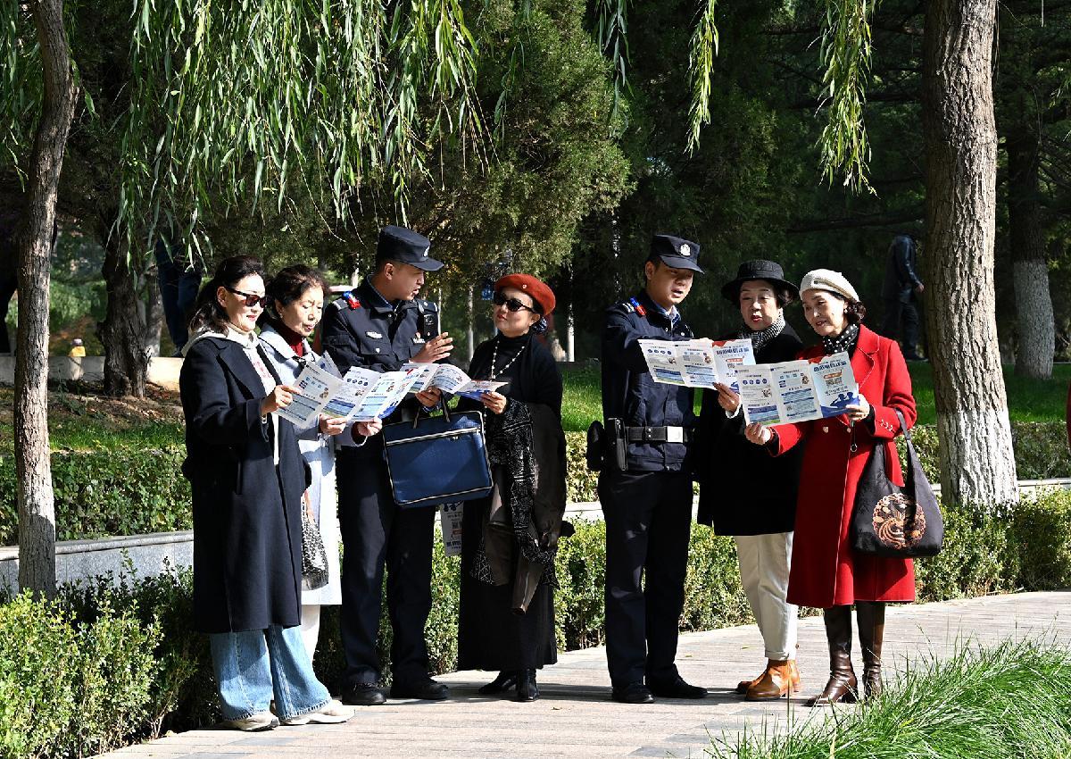 10月28日,甘肃省兰州市公安局安宁分局刘家堡派出所民辅警走进兰州市植物园,结合近期高发的电诈案例向中老年群众讲解防诈技巧。