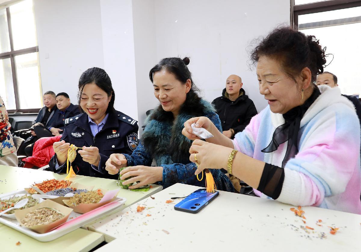 10月29日,山东省烟台市公安局组织民警来到莱山区迎春佳苑社区,与社区老人一起制作香囊,开展反诈、交通等安全防范知识宣传。