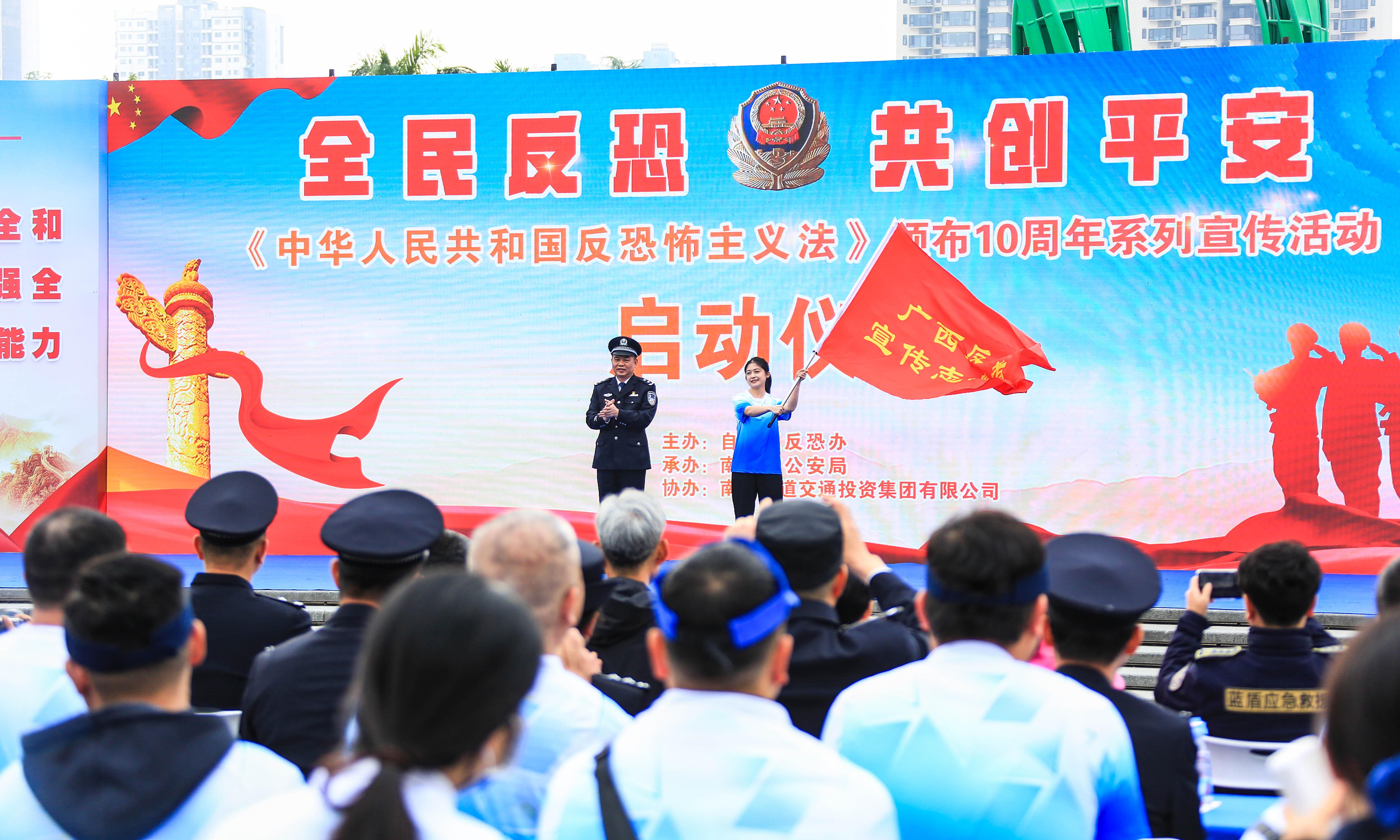 今年是《中华人民共和国反恐怖主义法》颁布十周年。12月6日,广西壮族自治区反恐办主办的“全民反恐 共创平安”《中华人民共和国反恐怖主义法》颁布10周年系列宣传活动启动仪式在南宁东站南广场举行。活动汇聚了广西反恐怖工作领导小组成员单位、联系单位与社会各界的广泛参与,着力提升全民识恐、反恐、防恐意识和能力,营造浓厚的“全民反恐 共创平安”宣传氛围。