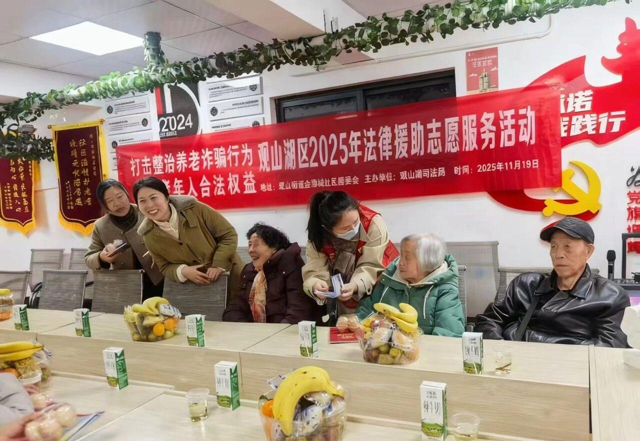 2025年11月19日,贵州省贵阳市观山湖区观山街道金海域居委会组织开展老年人集体生日活动,观山湖区司法局观山司法所顺势而为同步开展预防养老诈骗主题宣传活动,通过发放宣传资料与互动教学相结合的方式,为老年群众提供防诈知识“生日礼”。