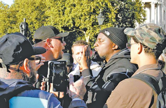图为在英国首都伦敦,对移民持不同观点的人们在抗议活动现场争辩。 新华社记者 高文成 摄