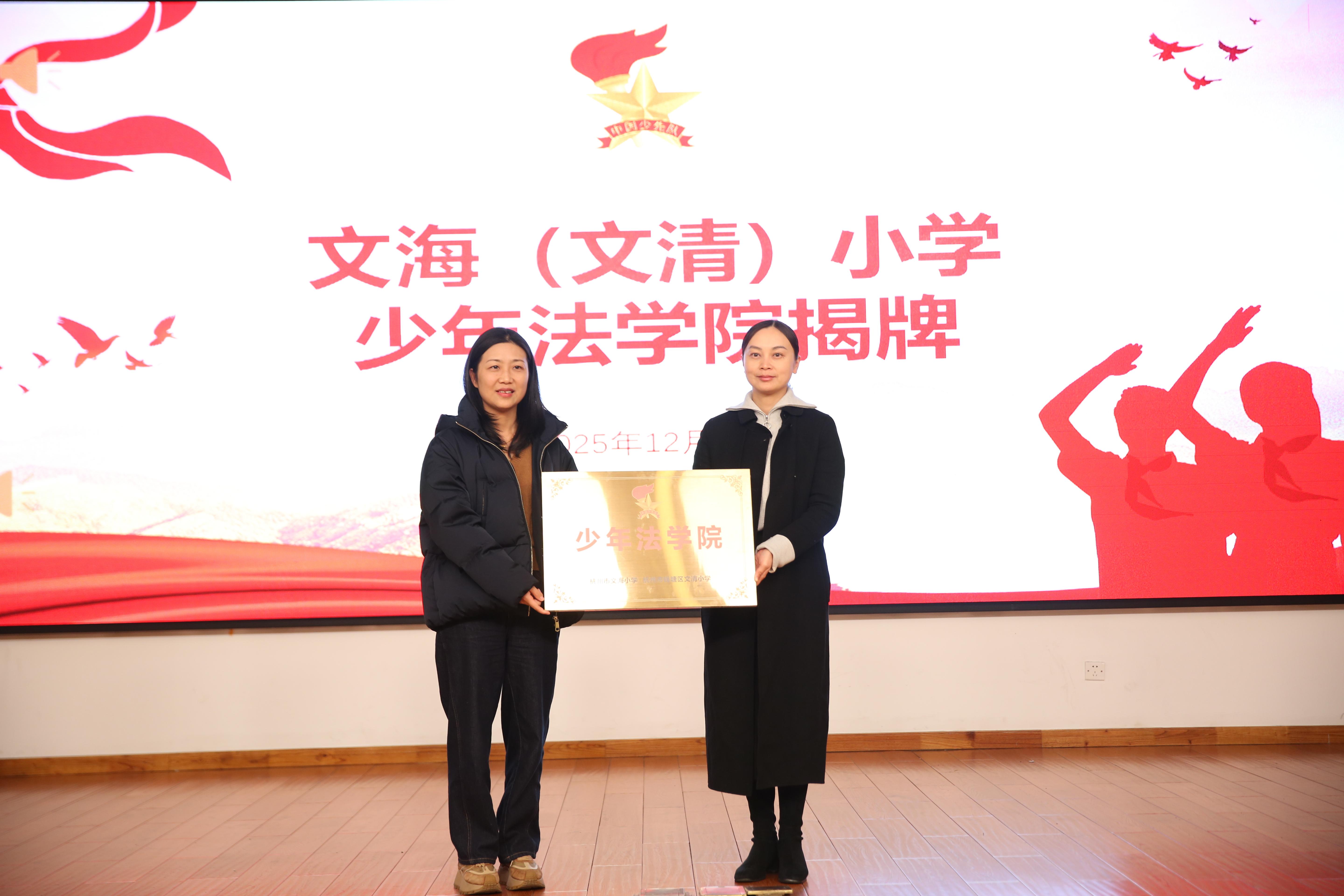 活动开篇,浙江工商大学法学院与文海(文清)小学代表共同举起“少年法学院”铜制牌匾。这枚牌匾不仅是校校合作的凭证,更像是一份“伴学约定”,标志着高校导师与文海少年的法治成长之路正式牵手。台下队员们脸上满是庄重与期待,掌声里藏着对未来一年专业陪伴的满心向往。