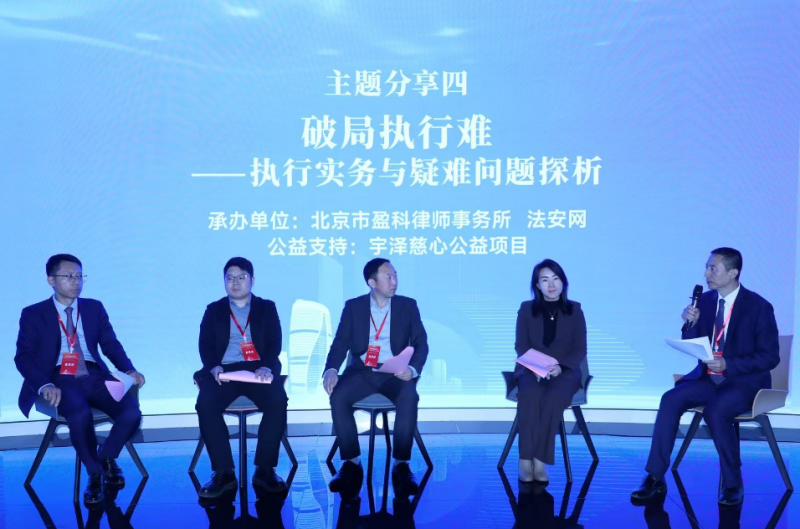 此外,在该主题的另一个环节中,北京德恒律师事务所合伙人律师孔威钧,北京大成律师事务所高级律师、北京市律师协会未成年人保护专业委员会委员杨强,北京市盈科律师事务所刑民行交叉部副主任、盈科北京重大疑难案件法律服务中心副主任、高级合伙人律师赵德坤,北京市盈科(丰台区)律师事务所学术委主任、刑事部主任赵红分别围绕《全过程利用“网络查控系统” 缓解民商事诉讼的执行难问题》《围绕“拒执罪的威慑作用”“保全与执行查控的衔接”两个核心问题分享思考与经验》《特殊资产的执行》《刑事案件财产刑执行的现实挑战与路径探索》《执转破与庭外重组结合》等主题,以圆桌论坛的形式展开了深入探讨,碰撞出思想的火花,为解决执行难问题提供了多元化的解决方案。该圆桌论坛由武景生主持。