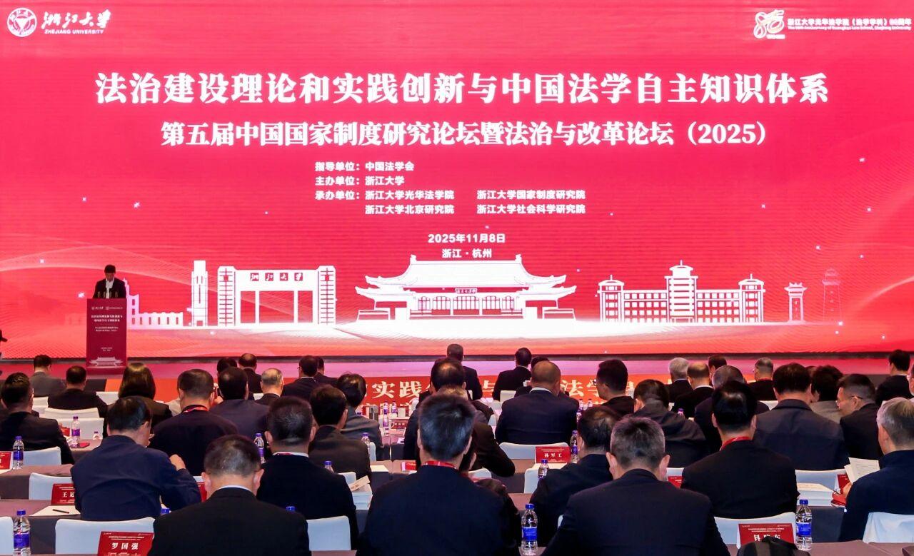 2025年11月8日,第五届中国国家制度研究论坛暨法治与改革论坛(2025)在杭州召开。此次论坛由中国法学会指导,浙江大学主办,浙江大学光华法学院、浙江大学国家制度研究院、浙江大学北京研究院、浙江大学社会科学研究院共同承办,并得到了教育部、最高人民法院、最高人民检察院、浙江省委政法委员会、浙江省高级人民法院、浙江省人民检察院、浙江省社会科学界联合会等单位的大力支持。本次论坛主题为“法治建设理论和实践创新与中国法学自主知识体系”。