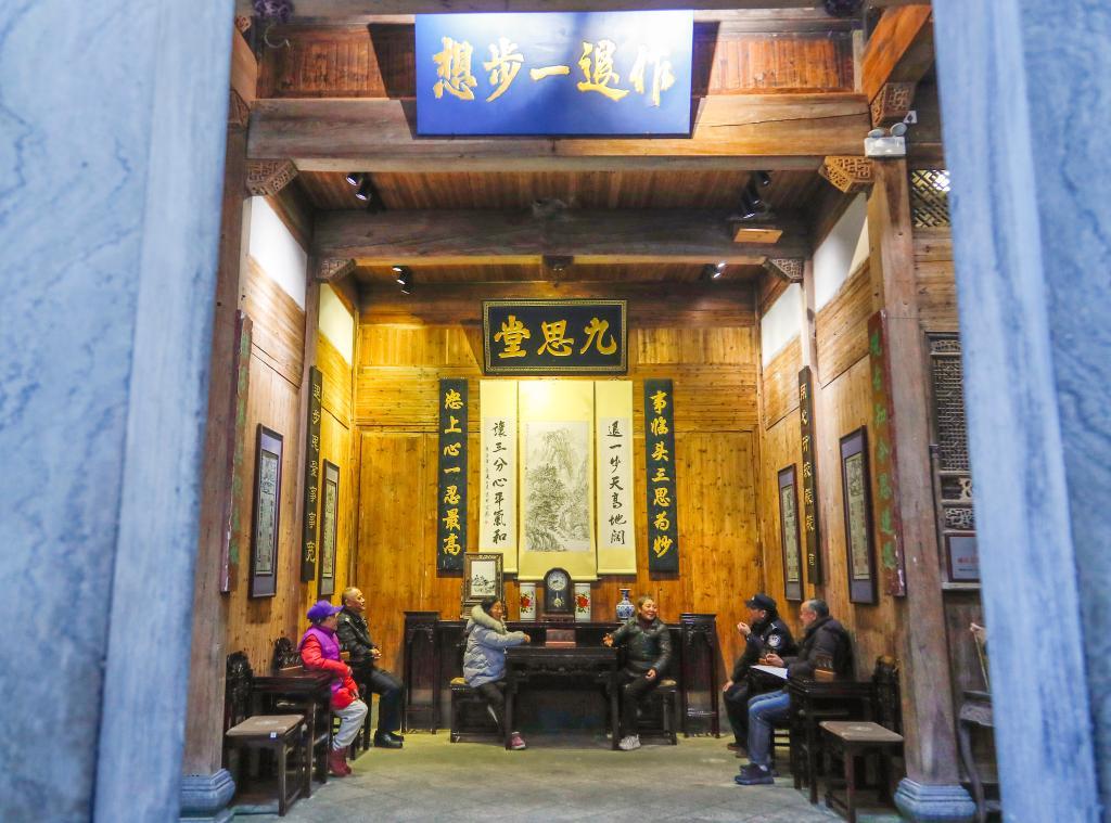 天井下,两张半圆桌拼成的“和合桌”还留着茶水余温;古宅门额上,“作退一步想”五个篆字格外醒目。