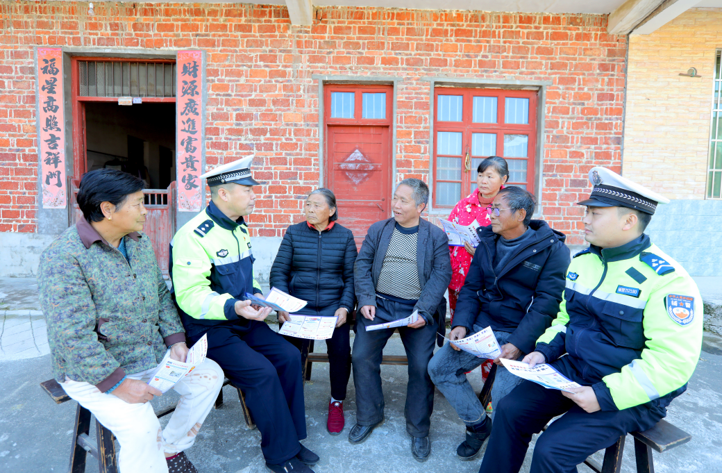 图为1月14日,民辅警在钤山镇田心村向村民宣传交通安全知识。