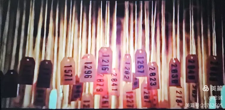伴随着画外音《日内瓦议定书》的读念,银幕上出现了密密麻麻代表着被日军野蛮和随意抓来无故人姓名的标牌,影片由此进入主题。