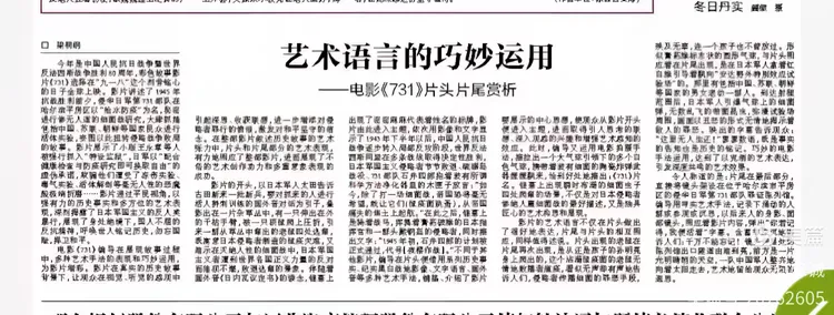 观看电影《731》,故事的真实性令人置信且撼人心魄,然而编导在展现故事过程中,多种艺术手法的表现和巧妙运用,更为影片增彩。影片在真实性的历史故事背景下,让观众在视觉、听觉的感观中引起深思和收获联想,进一步增添对侵略者罪行的愤恨,激发对和平坚守的信念,着实起到了可圈可点的艺术效果。