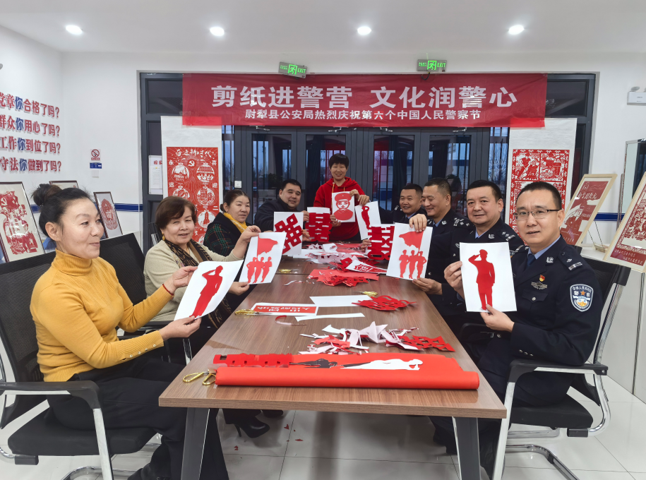 为庆祝第六个中国人民警察节,丰富警营文化生活,传承优秀传统文化,1月9日,新疆尉犁县公安局特邀剪纸艺术家及群众代表走进警营开展“剪纸文化献礼警察节”活动,以“警徽”“警察敬礼”等剪纸艺术作品致敬警察节。