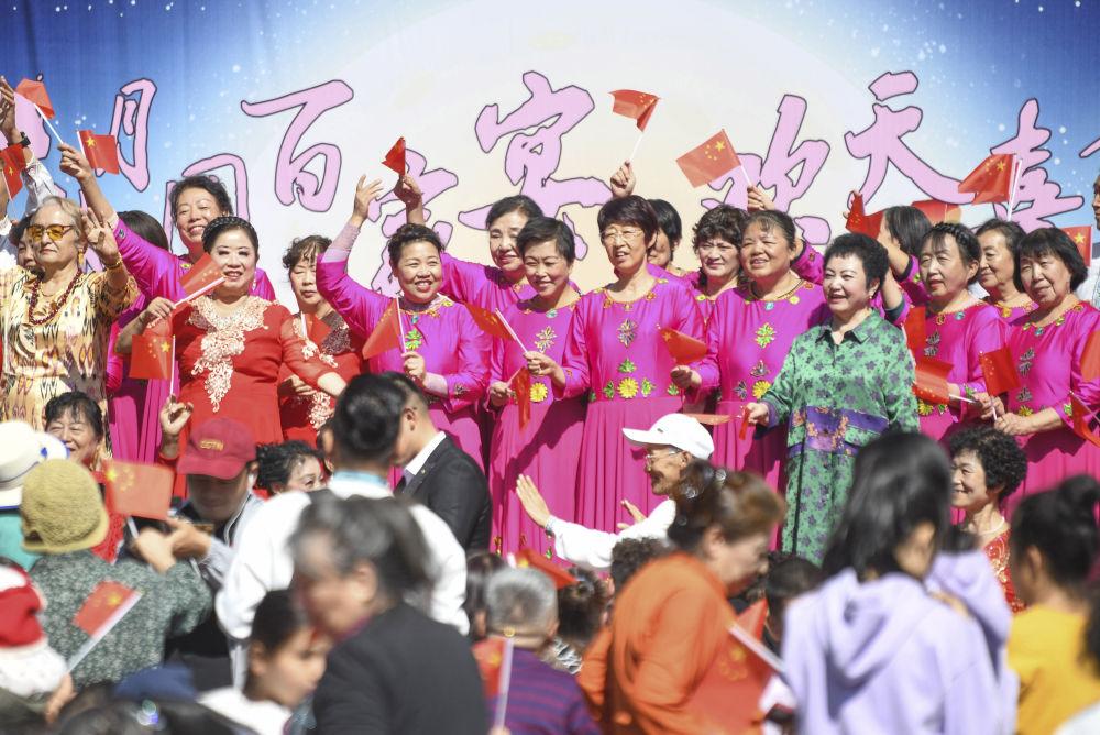 2024年9月15日,新疆乌鲁木齐市天山区固原巷社区举办“中秋月圆百家宴 欢天喜地迎国庆”活动,人们载歌载舞,共享节日欢乐。