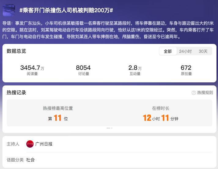 此案被报道后,环球网、上观新闻、《广州日报》等媒体接力传播,推高舆情热度,微博话题“#乘客开门杀撞伤人司机被判赔200万#”登上热搜榜第11位。